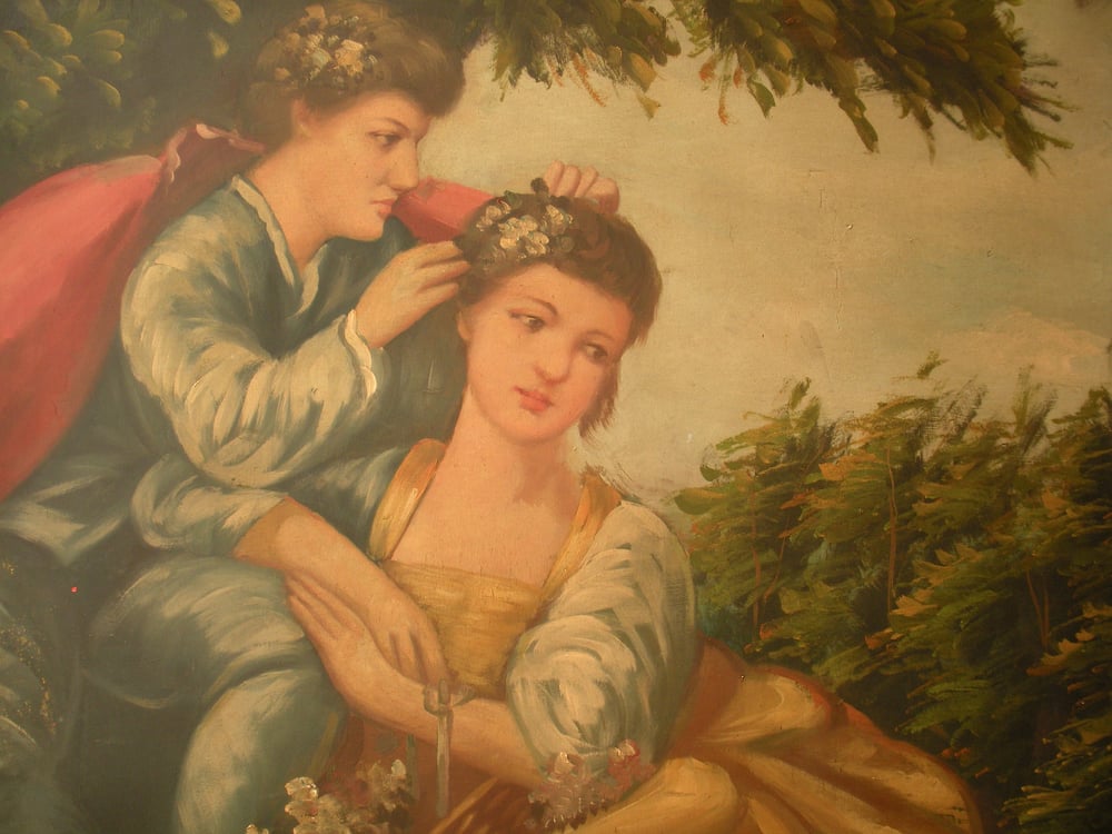 ...very special hand painted screen...late 19th century or early 20th century...beautiful scene...finials painted in gold...three panels...looks like a painted set for a baroque opera...the back is painted black...some scratches but in very good condition...combination of decor, art and furniture...can provide more photos upon request...