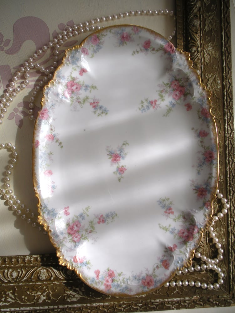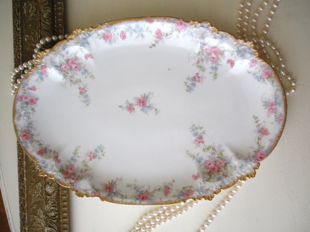 ...quintessential antique French porcelain...pink and blue with gold scalloped trim...wonderful platter for the dining table...or art for the wall...lovely piece in good condition...